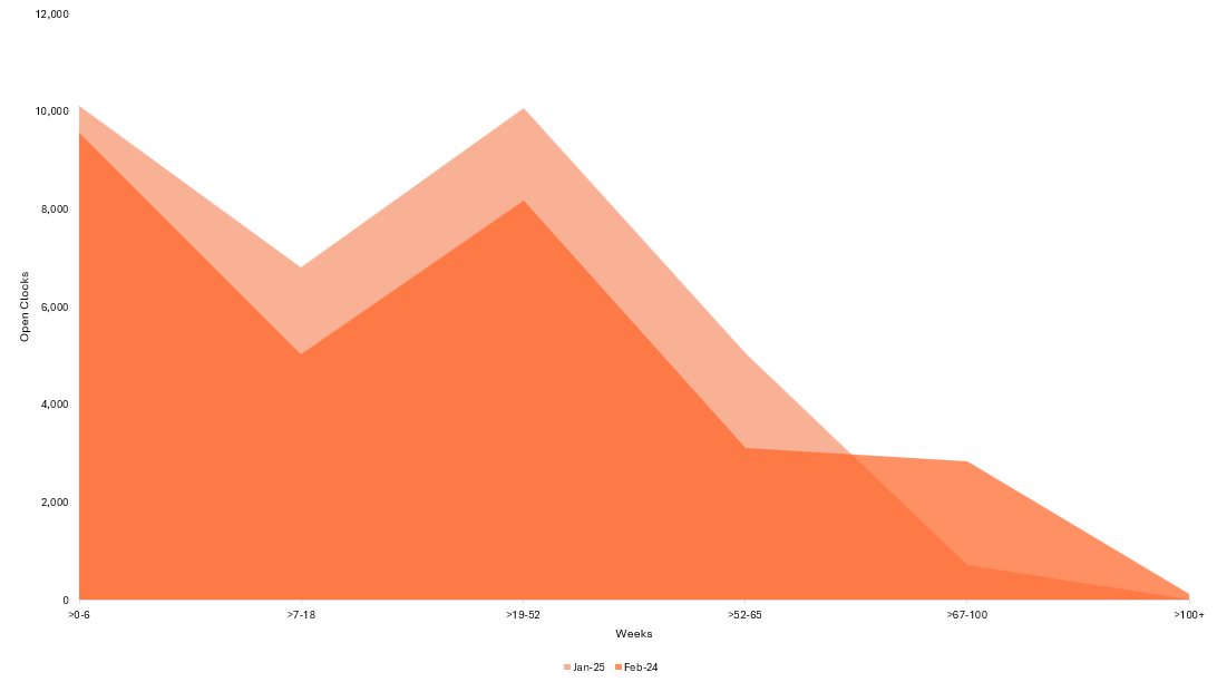 Over 55% of people with open clocks were waiting for a first outpatient appointment, and over 75% of patients have their clocks stopped in their first outpatient appointment.